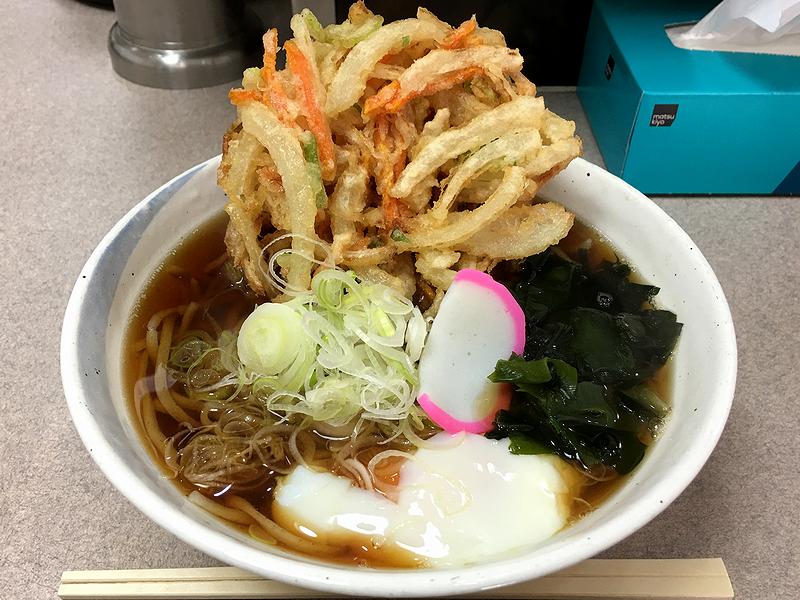 それでお店の名前どおり駅の東口から出て辺りを見渡すと、すぐ近くにあるお店を発見。注文は、入口の券売機で食券を買う方式なのですが、店頭に置いてあったPOPに惹かれて季節のかき揚げそばと、トッピングの温泉玉子を。で、カウンターには椅子があったので着席し、目の前にいた女性の店員さんに食券を渡すと、奥にいた男性の店員さんに「季節作っておきなって言ったでしょ?」と。こちらのお店の天ぷらはこの手のお店らしく揚げ置きが基本らしいのですが、こちらにしてみれば、お陰で揚げたてのをいただけるので逆に有り難いんですけどね。