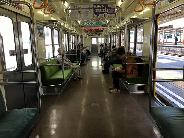 発車時刻が近づくにつれ乗客が集まってくるのですが、特に先頭車、更にはその先頭方向に近づくにつれシートに座っている乗客が増えることから、大師前駅の出口の位置が判りますね。もっとも、全体的に見れば空席を多数残して発車。出発して左にカーブしつつ高架線に登って、町並みを見下ろしつつちょっと走るともう終点の大師前駅に到着してしまいました。