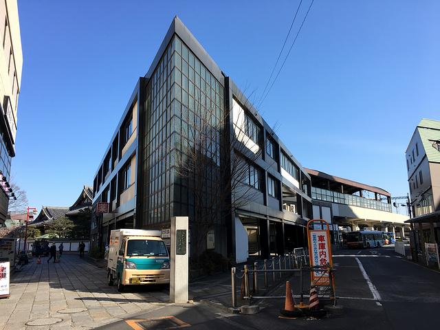 大師前駅は1面1線の単式ホームを持つ高架駅で、やたらとホームが広いなと思ったら、1面2線の島式ホームに出来るようになっているけどもう1線分はホームと高さをそろえた蓋をしてその部分もホームとして使っているそうで。で、無人の改札口を通って一旦外に。高架化に際して建てられた現在の駅舎は、かなりのトンガリ具合ですね。また、駅舎にはクリニックが入っていたのですが、東武宇都宮駅の東武診療所といい、東武鉄道の駅舎にはわりと珍しくないテナントなんですかね。