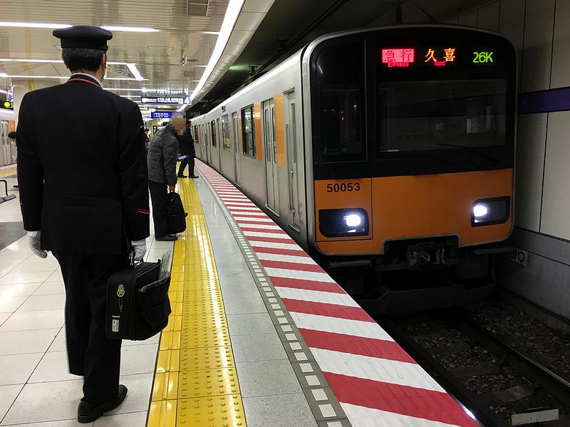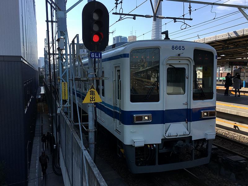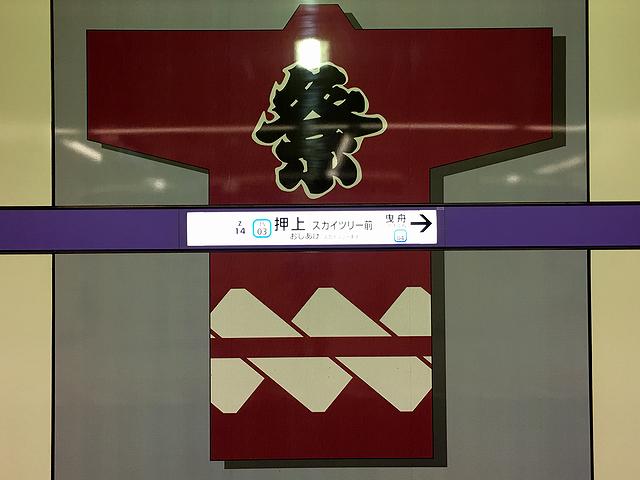 押上駅から引き返すのは、田園都市線からの直通列車、急行の久喜行き。車両は本日2度目となる(東武)50050系電車の10両編成です。で、今度は空いた車内で椅子に座ってゆっくりする間もなく、押上駅に到着しました。