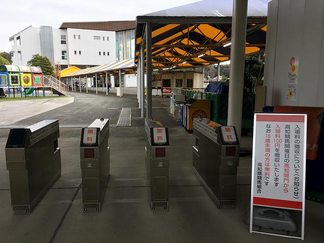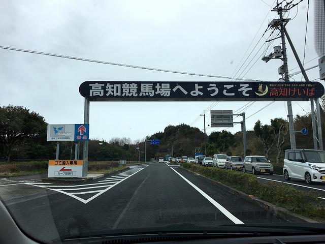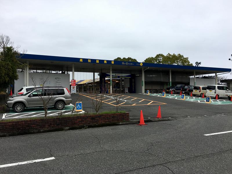 前回お伺いした時は桂浜から向かったためくぐれなかった「高知競馬場へようこそ」のゲートをくぐって、正午をちょっとだけ過ぎた頃、高知競馬場に到着。前回は満車で停められなかった入場口前の駐車場は、まだ空きスペースがありました。