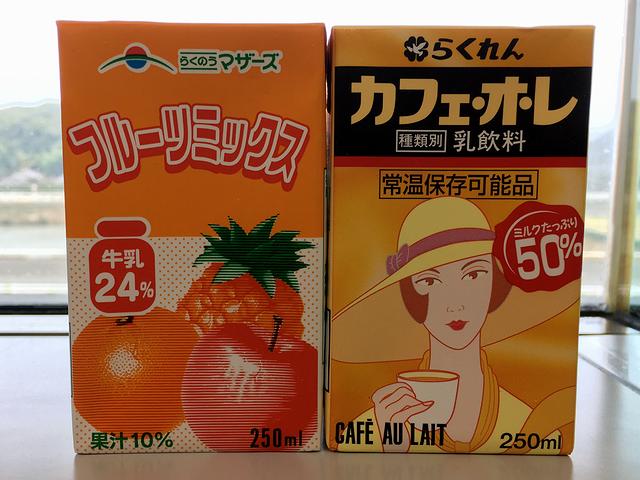 特別観覧席とは直接関係ないのですが、観覧席内の自販機で同行の家人が購入したパック飲料がこちら。で、よく見るとメーカーが違い、後で調べたところカフェオレの「らくれん」は四国乳業株式会社のブランド名だったのですが、フルーツミックスの「らくのうマザーズ」って熊本県酪農業協同組合連合会なんですね。