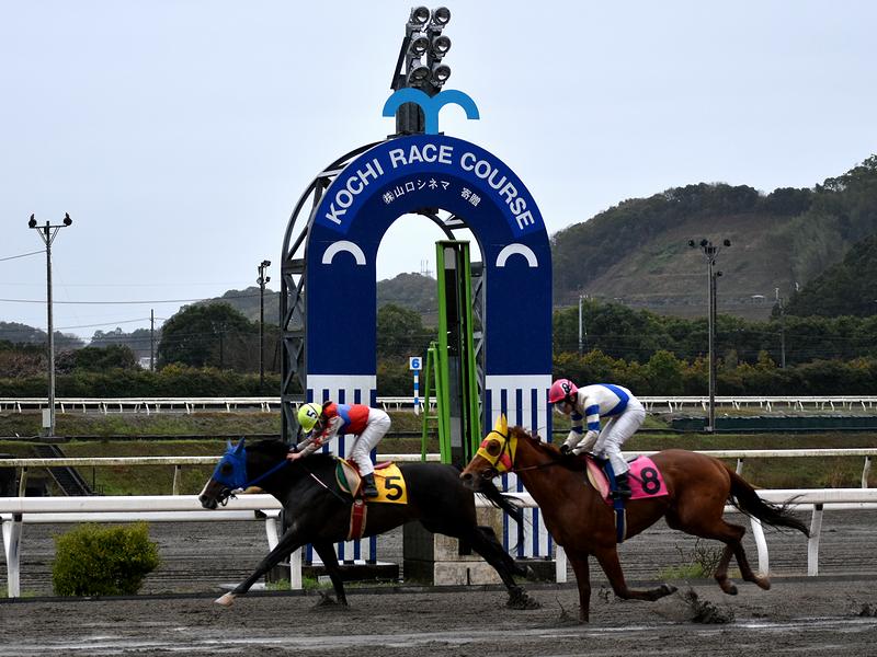 今回ゴールシーンを撮ったのはこの第3レースだけ。で、勝利した別府真衣騎手は第1レースも勝利しこの日2勝の活躍。2着は言わずと知れた高知競馬のトップジョッキーである赤岡修二騎手で、この日2勝2着3回3着1回とさすがの活躍でした。