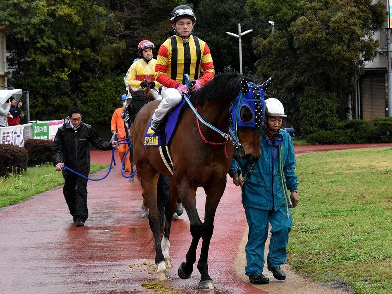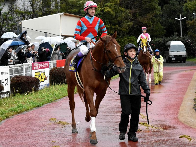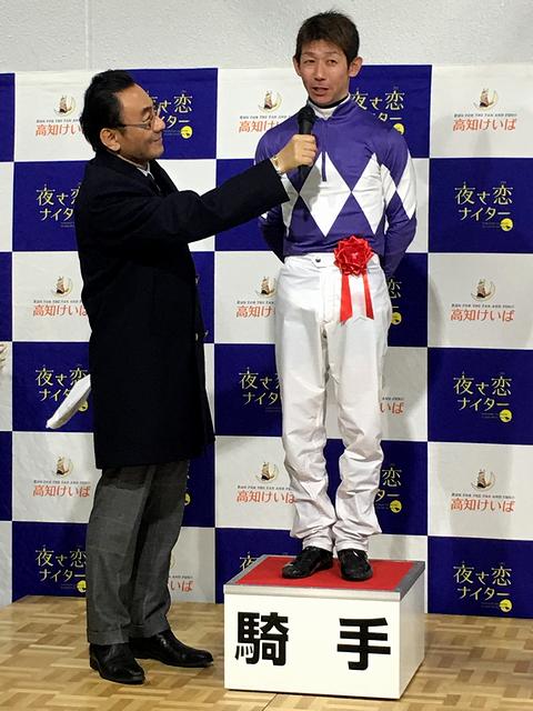 【8番人気の(4)ディアマルコ号(高知)と佐原秀泰騎手(高知)】