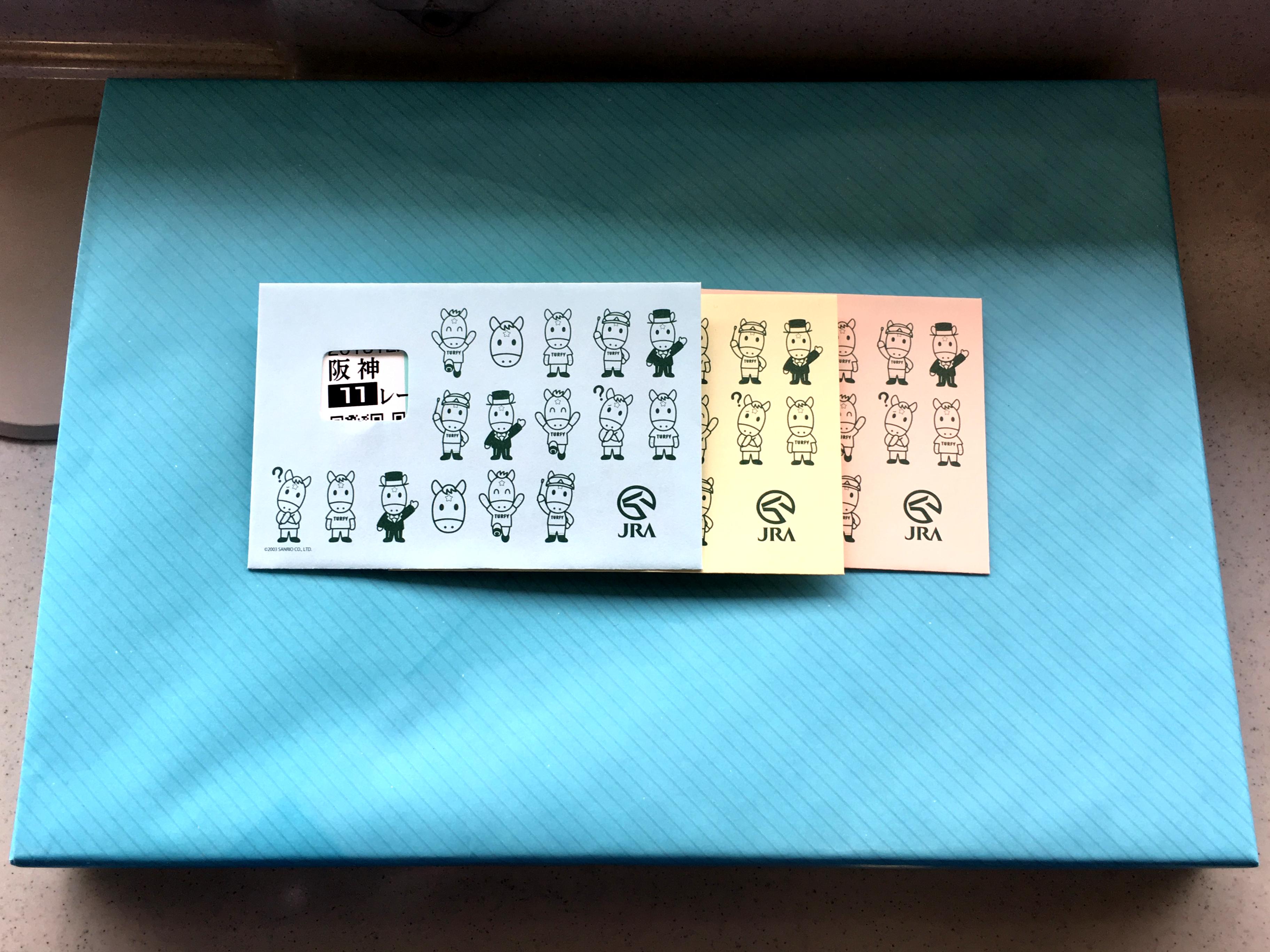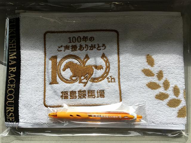 こちらは、ターフィーショップで購入した開設100周年記念マフラータオル。このところ良くある、スピードくじが付いたものだったのですが、くじの景品は(前回同じようなものを購入したホープフルステークスに続いて)ボールペンでした。