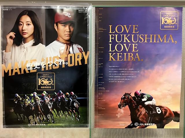 こちらは場内に貼ってあった開設100周年PRポスター。もうちょっと綺麗に貼ってあるものを撮れば良かったですね……。で、向かって右側のものは左端に福島競馬場の年表が入っているのですが、そこに昨年、福島競馬場思い出のベストホース大賞に選ばれたツインターボ号の七夕賞勝利がしっかり入っていました。(そういえばこのポスターの勝負服も、ツインターボ号のものと似ていますね。)また、左手のポスターは開設100周年アンバサダーである、女優・モデルの武田玲奈さんと、楽天イーグルスの則本昂大投手なのですが、武田さんはこの日、イベントのため競馬場に来場されていました。