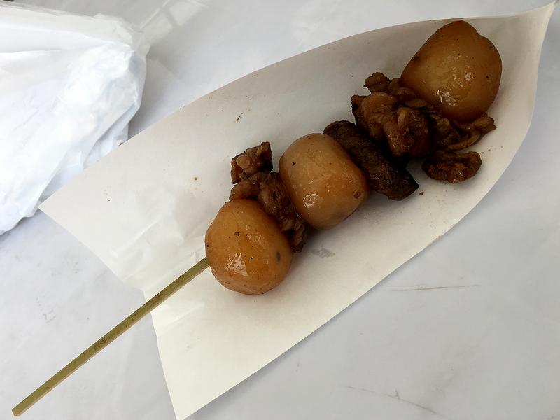 山形のソウルフードに玉こんにゃく(玉こん)というのがあり、通常は一口大の丸いコンニャクを、醤油とスルメで煮る(最近では栃木県でも、セブンイレブンやヨークベニマルなど、セブンアンドアイホールディングスのお店で売っていますね。個人的に好物だったりします。)のですが、なんとこちらのは贅沢にも、コンニャクの間に牛肉が挟まり、そしてその味がこんにゃくに染みて、もう、たまらないというか。