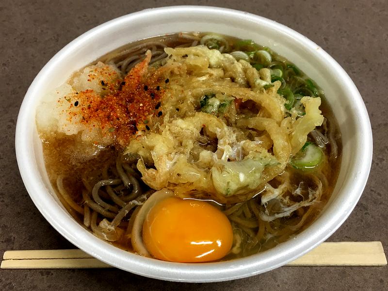 それで今回いただいた品は、かき揚げ+生卵。ツユからは開店直後にもかかわらず、前回(午前9時過ぎ)いただいた時同様の、煮込まれたような昆布っぽい風味が。また、味の濃さは若干薄めで、(しょっぱいつゆが好きな)自分的には、(特に具がかき揚げだと)もう少し塩気が欲しいと感じてしまいます。そして蕎麦は、いつものテュルテュルっとした柔らか食感でした。