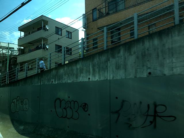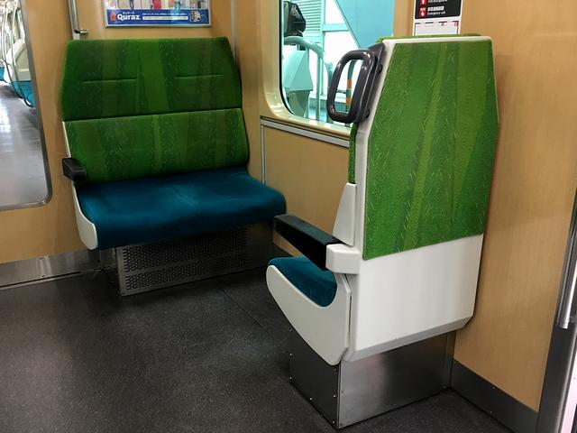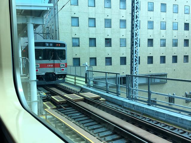 で、その7000系電車。車内は基本的にロングシートなのですが、2両目車端部のみクロスシートになっていて、進行方向に対して後ろ向きの1人掛け席が1つだけ空いていたのでそこに座ります。ここでも、ロングシートに座るよりは景色をよく見られますから。ちなみに、向かい側の2人掛け席には、普通とはちょっと違う服装をした若い男性が座っていて、鞄から取り出した小型のスケッチブックにさらさらと素描をしているのですが、こういうお客さんが普通に乗っているのって、都会の真ん中なのに3両編成の列車が走る池上線ならではのような気がします。