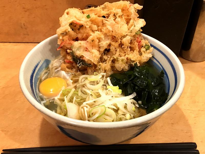それでこちらの注文は食券制。店頭に置かれた券売機で食券を購入してから入店するのですが、そこで少々迷ったあと、かき揚げ(そば・うどん)と生玉子の食券を購入。(天玉の食券があったのに気がついたのは、かき揚げのボタンを押した後でした。)しぶそばのかき揚げは季節というか、一定期間ごとに変わるようで、この時はタネが紅しょうがと高菜、そしてタマネギになっていました。