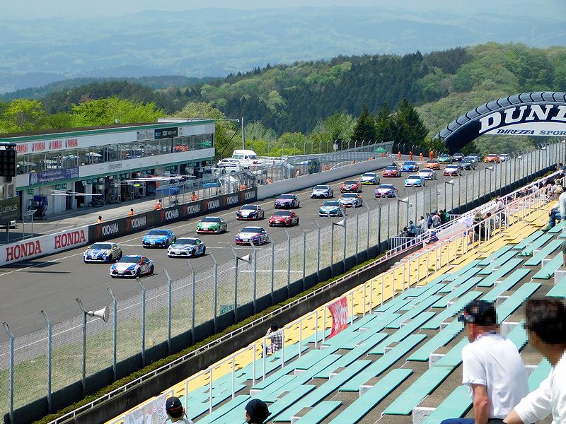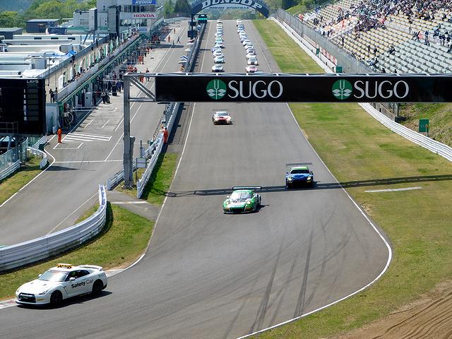 1周のフォーメーションラップの後、公式記録によれば13時58分07秒、ローリングスタートで3時間のレースが開始されました。ちなみに、レース名が時間で表される場合、スタートから所定の時間(このレースなら3時間)が経過した時点で先頭を走っていた競技車両がコントロールライン(スタートフィニッシュライン)を通過した時点で競技成立となるのですが、ようは、3時間の間に一番長い距離を走ったクルマが勝ち、ということで。で、レースレポートについては、ピレリスーパー耐久シリーズの公式サイトにオフィシャルのものや参加チームのものが載っていますし、また全車の順位についても前述のサイトやスポーツランドSUGOの公式サイトに載っているので、以下は個人の感想をつらつらと。