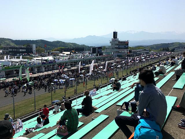 今回は、グランドスタンドの中でも最も第1コーナー寄りの最上段に腰を落ち着けることに。ここなら、1コーナーから2、3コーナーを抜けてヘアピンコーナーまで見渡せます。