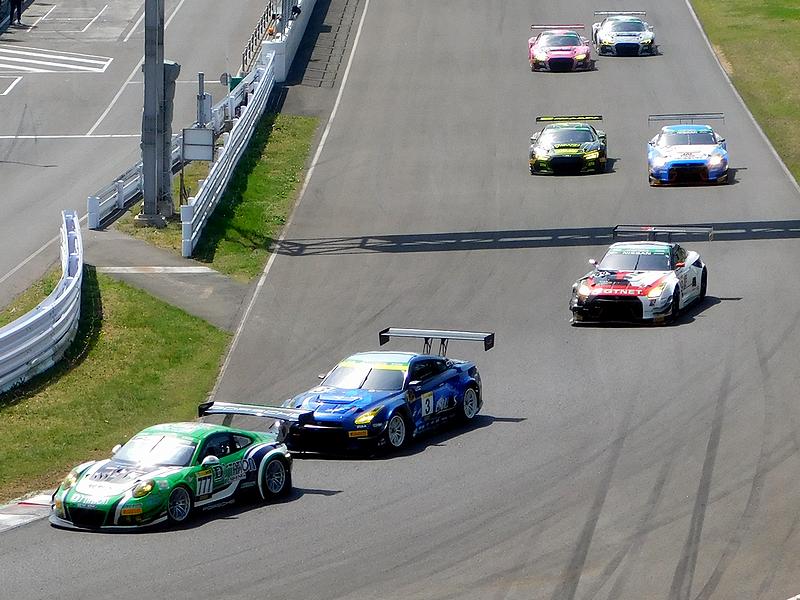 そして各クラスで印象に残ったのは、まずGT-Xクラスの1,2,3位争い。結果的にポールトゥウィンとなった777号車のポルシェ991なのですが、序盤に発生したFCY時にドライバー交代まで済ませた82号車のアウディR8が、それを生かして途中でトップを奪取。ただ、今回の菅生のコースではポルシェの速さが勝っていて、その後の追い上げ、そして追い抜きは手に汗握りました。また、同じく手に汗握ったと言えば、24号車日産GTRの追い上げで、前を行く82号車に迫ったものの、そんな最中に痛恨のドライブスルーペナルティを受けて逆転ならず、82号車が2位、24号車が3位という結果に。ラップタイムでは一時24号車が82号車を完全に上回っていただけに、見ていて勿体なかったなぁ、と。ちなみに今回優勝した777号車ですが、3時間の間に1周3.704256kmのコースを124周、約459.3kmを走行しました。