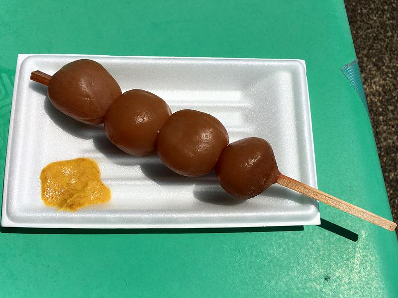 これらは、グランドスタンド入口左手のお店で買った品々。焼きそばは細くて短めの麺がこういうところの焼きそばっぽくて悪くなかったのですが、具におなじみのモヤシとキャベツの他、タマネギが入っていたのが珍しく感じました。またやきとりは、5本入りで500円という価格や甘塩っぱいタレが、とってもベーシックという感じで。そしてこの中での一番のオススメかつ個人的に一番思い入れの深い品が、玉こん。実は、玉こん(玉こんにゃく)という料理を知ったのが昔ここでいただのがきっかけ(なので当時は山形名物ではなく宮城名物という認識だった。)で、加えて一度食べたら妙にハマって、それ以来、来た時には必ずいただいていたという。で、今回久しぶりにここでいただいたのですが、スルメの出汁と醤油が良く染みた玉コンニャクが、何とも良い感じでした。