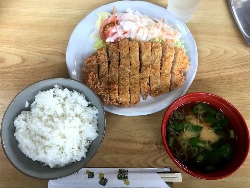 それで私がいただいたのが、こちらのロースカツ定食。注文からさほど待たずに、気取らない感じで登場したのですが、早速卓上のソースをちょっとだけかけていただけば、これがびっくり!!さほど厚くないサクッとした衣に包まれたロース肉は、厚みはそれほどないものの、ものすごくジューシー。さすがはとんかつ専門店だけあって、肉の下ごしらえもぬかりなく、火の通し加減というか揚げ加減が素晴らしいですね。で、更に噛みしめると、衣の香ばしさ、肉の味わい、そしてソースが口の中で三位一体となって、これがもう。それにしてもこのソース。あらかじめ辛子が入っているような風味があるのですが、これがまたトンカツと合いますね。そしてカツをいただいた後は、わりと大きめの茶碗で出てきたご飯を一口。お米自体も美味しかったのですが、カツと一緒だと、更に美味しくいただけます。なので添えられた生野菜を箸休めに、更には気取らない感じの味噌汁も飲みつつ、一気に完食してしまいました。