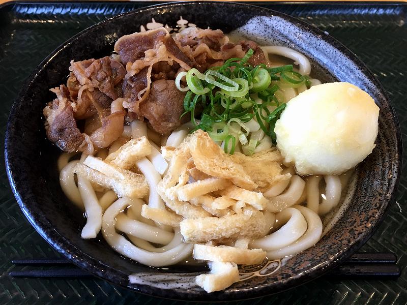 それで注文したのが、「おすすめメニュー」と書かれた牛肉うどんの中サイズに、個人的に好物の一つである、半熟玉子天を追加して。レジでお金を払い空いた席に移動。別皿の半熟玉子天を丼に投入(今回写真はこの段階で撮っています。)し、いざ。