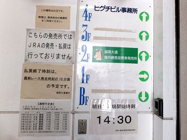 今年の夏の旅の最後というか、盛岡城を観て、名物のじゃじゃ麺を食べてあとは家へと帰るだけなのですが、最後の最後にもう1箇所とばかりに立ち寄ったのが、盛岡の中心市街地にあるUMACCO(うまっこ)岩手大通こと、盛岡大通場外発売所。本日は水曜日なので岩手競馬はやっていませんが(っていうか、やっていたら盛岡なり水沢なり本場に行っちゃうよなぁ…。)、他場の場外発売をやっているようなので、どんなもんかなぁ、と。