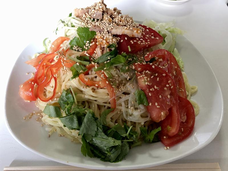 それで後述する家人の品よりも若干遅れて登場したのですが、その見た目は、思ったほど凶暴ではなかったというか、確かに、こんもりと盛り上がった麺量はかなりのものだとは思うのですが。それで早速、全体を軽く混ぜてからいただいてみると、タレは胡麻ダレで、量的にはギリギリ全体に回るくらい。あと辛さはほとんど感じられないというか、これなら、(量的なものは別として)どなたでもいけるんじゃないでしょうか?(ちなみに辛さについては、途中から卓上のラー油を追加すると良い感じでした。)また麺は、阿Qさんの代名詞ともなっている自家製の細麺。しっかりと締められているので、麺の持つコシ(弾力)とアシ(延び)、そしてツルツル感が増して良いですね。そして具は、天辺に載る自家製のチャーシューの他、キュウリとトマト、レタスあたりは一般的なのですが、三つ葉とパプリカが珍しく感じました。で、中でも三つ葉は、その香りがいただいている途中に時々アクセントとなって、食べ飽きるのを防いでいるような気がしました。
