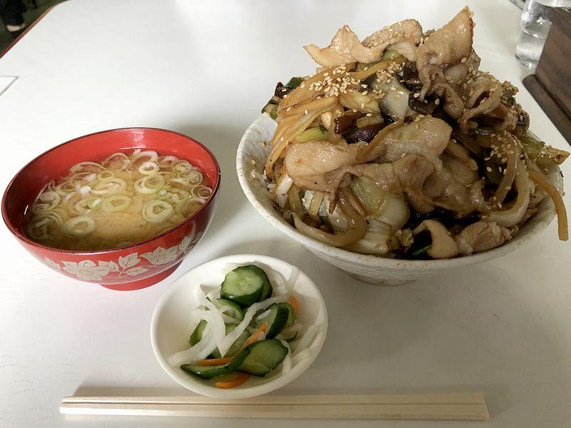 こちらは、阿Qさんの代表的メニューの一つと言っていいと思うくらいの品なのですが、家人も私もこれまで未食でした。で、写真のとおりボリューミーなので、1/3以上私がいただくことになったのですが、醤油ベース?の甘塩っぱい特製のタレで炒められた豚肉と、シイタケ、白菜、ニンジン、タマネギ、白ネギ、そしてタケノコなどの野菜類は、ご飯とものすごく合うというか、ワシワシとガっつくと最高ですね。あと付属の味噌汁は、具が絹ごし豆腐と白ネギでした。