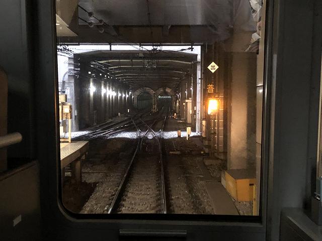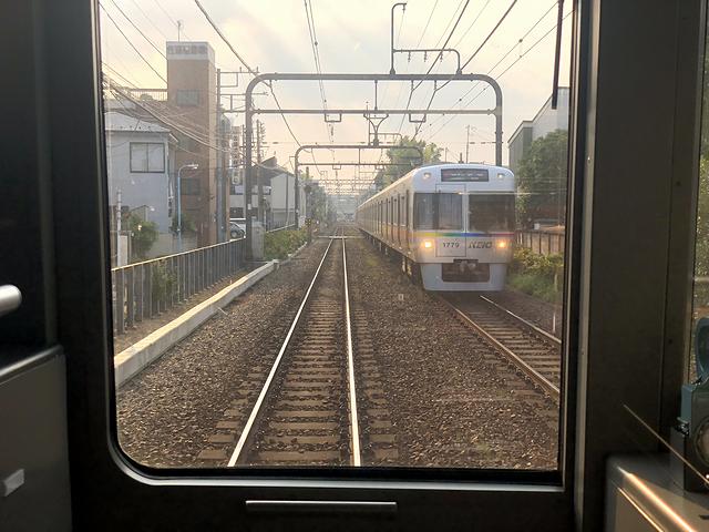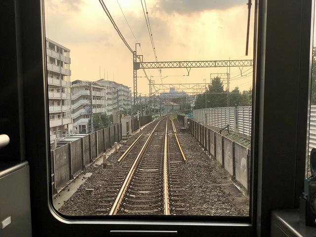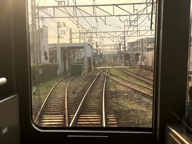 それで先発の急行(16時36分発)ではなく、次発各停の(16時37分発)に乗車する事に。ちなみに、井の頭線で使用されている車両は、全て京王1000形という形式で、製造時期が平成7年(1995年)から平成22年(2010年)と長きにわたっているために細部が違っていたりするのですが、今回乗車する1734Fという編成は、その最終編成に当たるそうで。で、運転席直後の特等席が空いていたので、吉祥寺駅までたかだか30分ということもあり、その特等席に立って前方の景色を眺める事にしました。