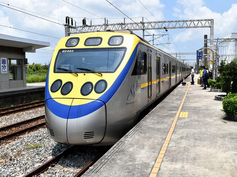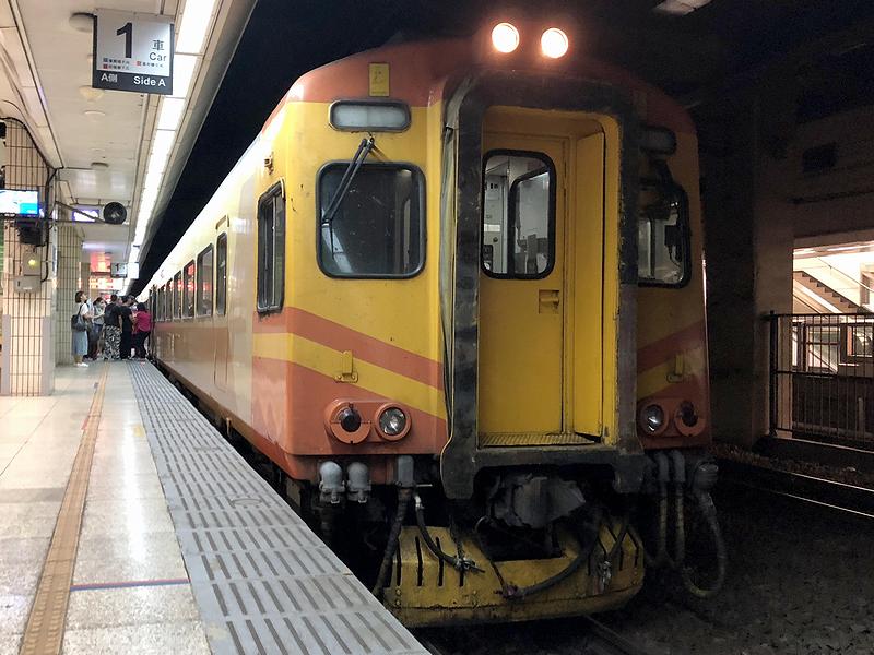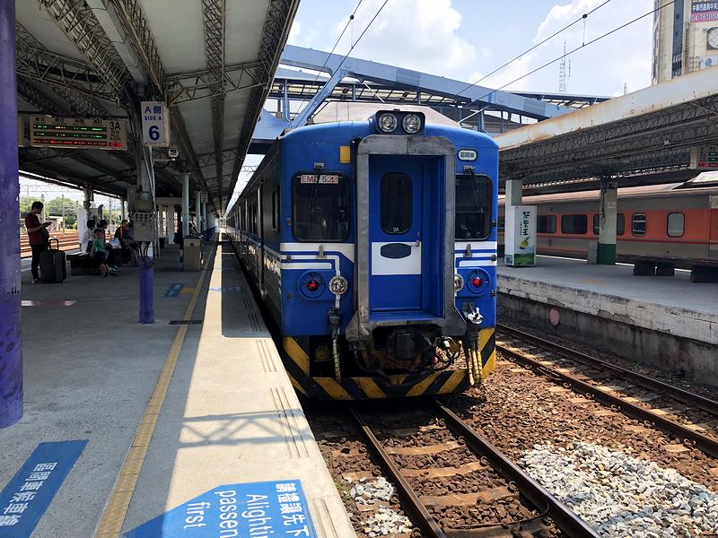 「謝謝」と言いつつ頭を下げてその月台に向かうと、成追線の列車が入線。海線の通霄(トンシャオ)駅始発で、成追線を通って山線に入り、台中過ぎて豊原(フォンユェン)まで行く2613次区間車で、その車両は初日に乗ったEMU800型電車の8両編成であったが、青色と黄色の塗り分けが初日の車両とは逆、車内も全ての車両がロングシートになっていた。
