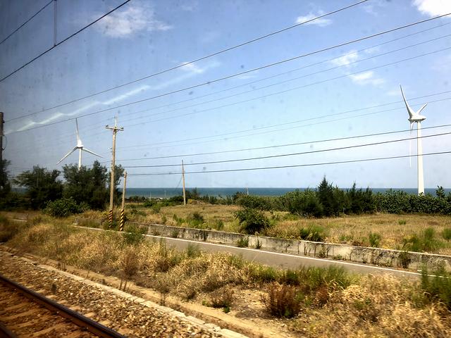 それでこの列車は海線を経由する。竹南を定刻の9時40分に発車した列車は、次の談分駅を通過。すると、車窓には、台湾来てから初めて目にすると思われる水田が現れた。その一部は田植えをした直後のようであったが、一部が熱帯にかかる台湾は、今頃が田植え時期なのだろうか。そして台湾海峡の海岸線に近づくにつれ、今度は巨大な風車が多数現れるようになった。