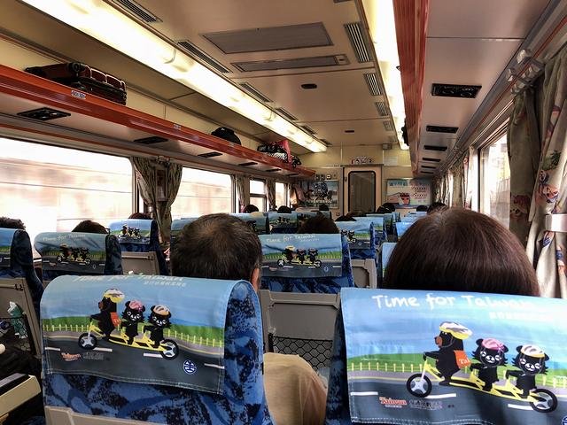 その座席へ行き腰を落ち着けたところ、横幅こそJRの在来線特急用車両と変わらないように思えるが、前後の間隔が大変広く足置きも装備されていて、日本のグリーン車並みである。ただ、テーブルがなく、窓の上部に取り付けられた読書灯は点灯しなかった。それとシート上部、ヘッドレストにかけられた布には、台湾政府観光局のキャラクター「喔熊」(オーション)、英語表記だと「OhBear」に加え、台湾鉄路管理局のキャラクター「鐵魯」(ティエルー)と「漢娜將」(ハンナーシァン)が3人揃って楽しげに自転車をこいでいる。