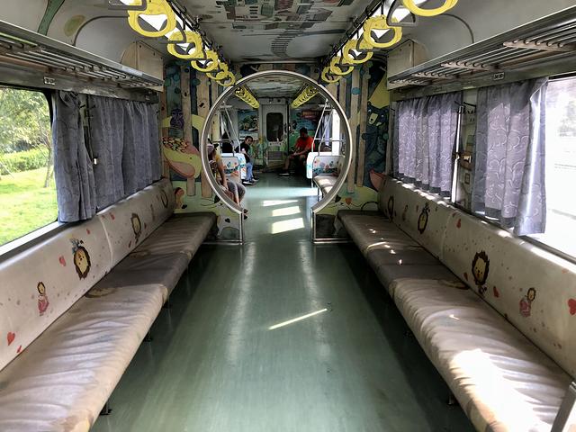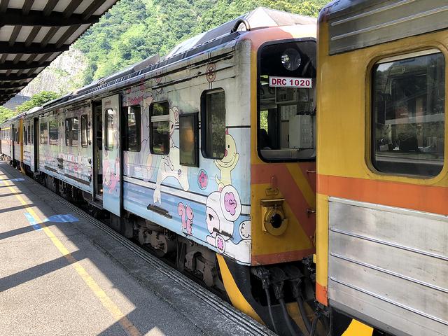 二水から乗車するのは、14時40分発の2717次区間車。車両は昨日も乗ったDR1000型気動車の3両編成で、中間車の外観は可愛らしいラッピングが施されている。特に狙ってはいなかったのだが、たまたまホームで待機していた場所が良く、先頭車運転席横の特等席に座ることが出来た。またこの先頭車は、ラッピングこそされていないが、車内のシートや洞門部分に可愛らしいイラストが描かれている。