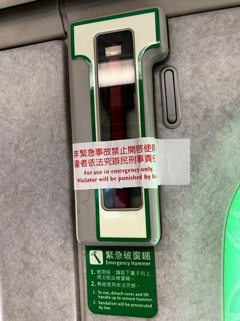 まず先頭切って乗車した時、デッキと客室の間の自動扉が、日本の新幹線ように何もしなくても開くものではなくボタンを押さないと開かないことで後ろのお客さんに軽く迷惑を掛けてしまったのだが、その他にも、前面の形状や乗務員用扉の有無など新幹線700系電車と細かい違いがあり、その際たるものが窓際に備え付けられている脱出用ハンマーではないだろうか。