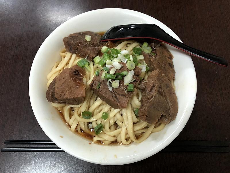 盬埕埔で降り、スマートフォンの地図を頼りにまず向かったのは、当地では有名な牛肉麺(ニュウロゥミェン)の店。有名店らしく店内に加えて店頭に置かれたテーブルは地元客と観光客で溢れ、中には日本人のグループも。そこでは、その店の名物となっている牛肉拌麺(ニュウロゥバンミェン)、汁なしの牛肉麺を食べたが、これはたいへん旨かった。