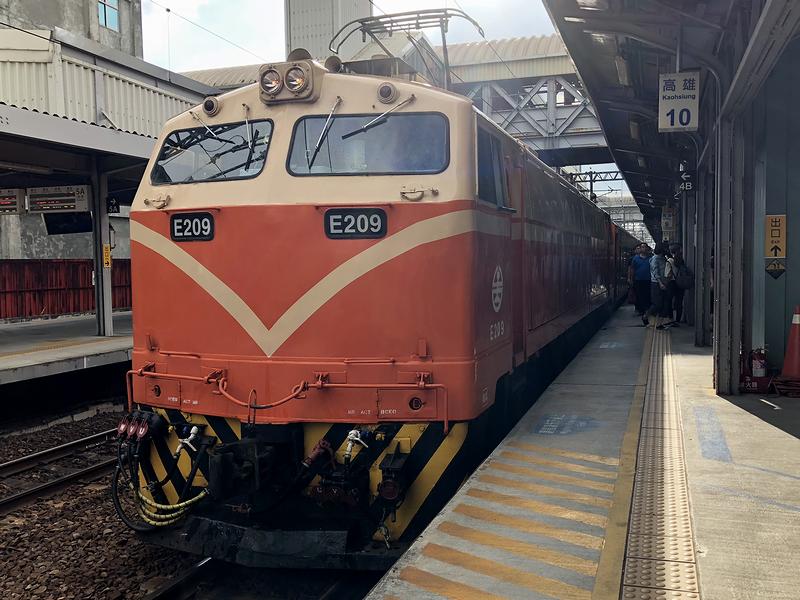 TR-PASSを見せて改札口を通り、長い跨線橋を渡って506次莒光号の発車する第4B月台(ユエタイ)へと移動。程なくして、E200型というアメリカ製の電気機関車に牽引された、長い編成の莒光号が入線してきた。