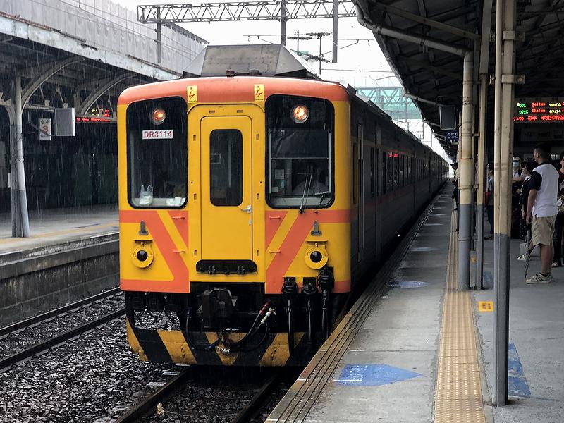 ホーム上の案内表示では「準點」(ジュオデェン)、日本で言うところの定刻となっていたが実際は2分程遅れて到着した。車両は、DR3100型という形式の自強号用柴油車(チャイヨウチャー)、日本で言うところのディーゼルカーの9両編成。この列車が乗り入れる屏東線と南廻線の一部は、現在電化工事が進んでいるものの、一部が非電化のまま残っている。また一見すると、昨日まで何度か乗ったローカル線用のDR1000型気動車とそっくりであるが、これは両車とも日本の同一メーカーで同時期に作られたためであろうか。
