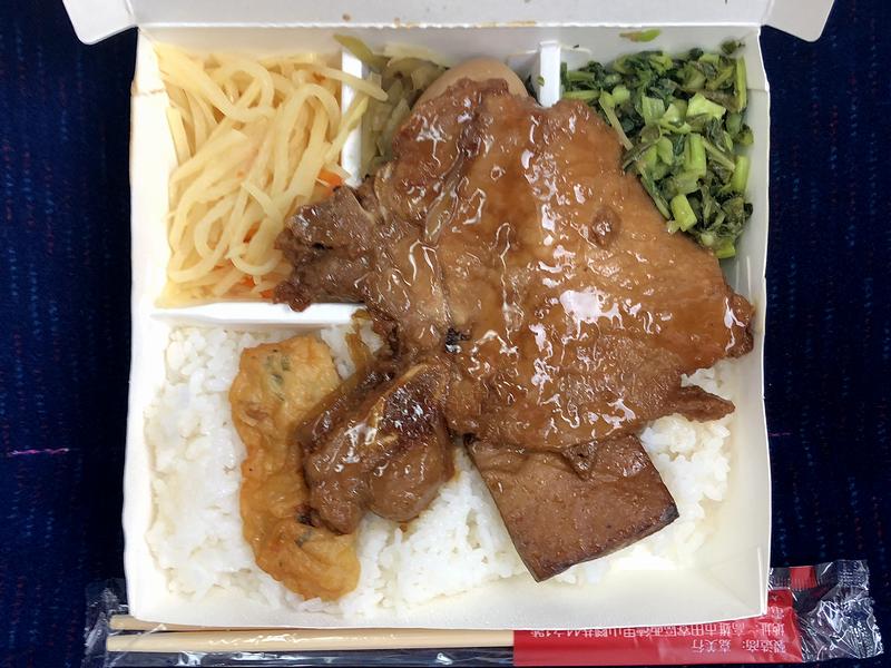 この列車を降りるまでは30分もないが早速いただく事にして蓋を開けると、ご飯にかかるように大きな排骨(パイグー)、日本で言うところのパーコーが載っている。まずはその排骨から箸を付けたところ、歯応えは硬く無く、味付けは八角など当地独特の香辛料は効いているものの、丁度良く醤油味が染みていて旨い。また同じような味付けになっているのは、卵と、「豆乾」と言う固く作った当地の豆腐であろうか。他にも魚の練り物や、筍の千切りを煮たもの、雪菜と呼ばれる当地の青菜の漬け物などが付け合わされているが、どれも当地らしく塩気が控えめな味付けである。