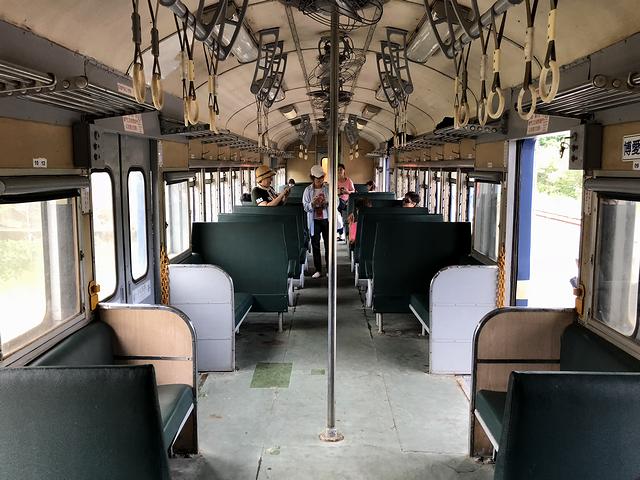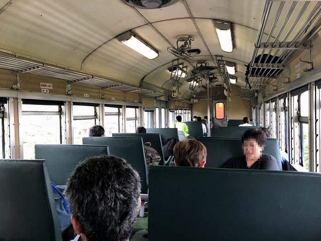 車内の設備は、ドア付近を除いて回転式のクロスシートが並んでおり、シート表面はビニール製。雨の中、窓を開けたまま留置されていたのか、そのシート表面には水滴が付いている。また冷房は無く、天井には扇風機が付いているが、スイッチが入っていない。もっとも、そのスイッチは壁に付いているので、勝手知ったる風でそれを入れると、それを見た他の乗客も真似をしてスイッチを入れた。