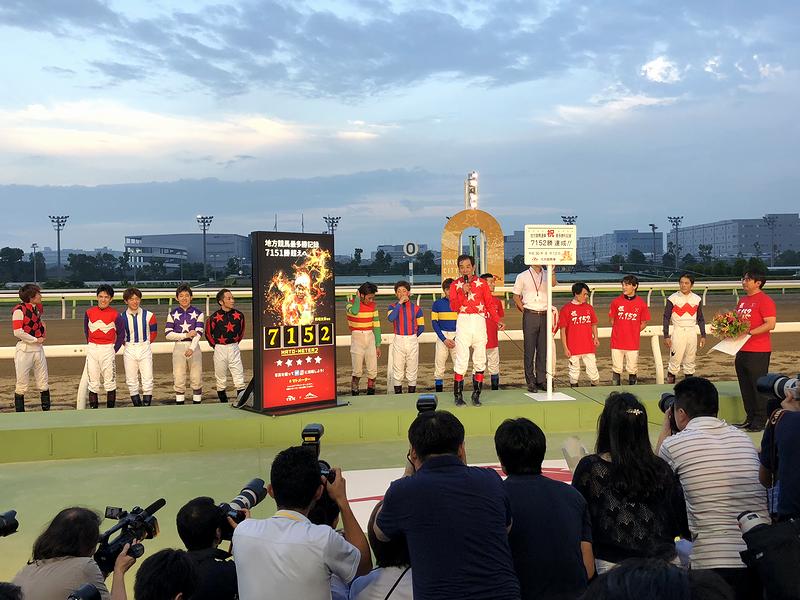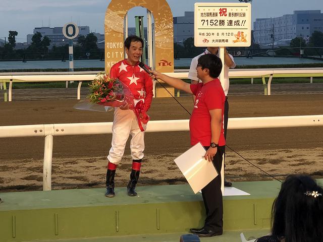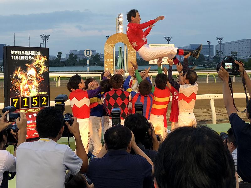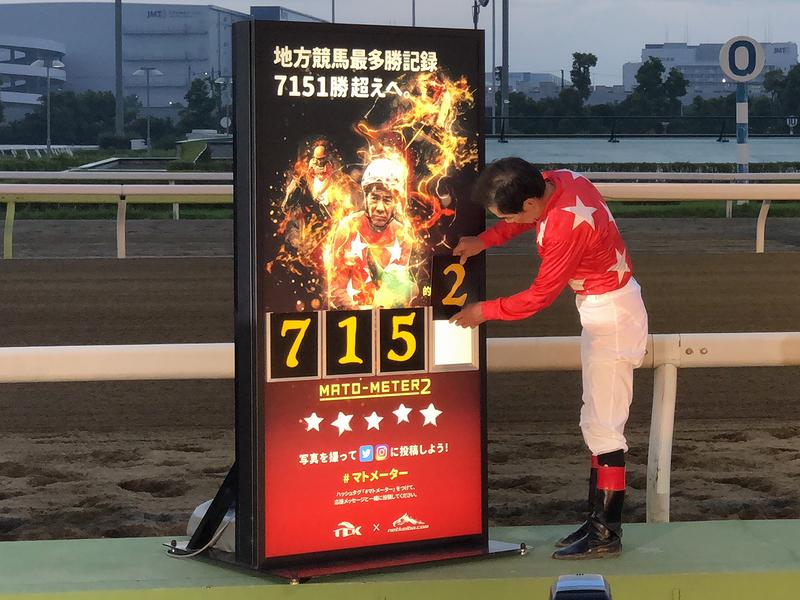 大井競馬所属の的場文男騎手と言えば、地方のみならず日本の競馬界のレジェンドとも言える存在。1973年のデビューから積み上げた地方競馬通算勝利数は7000を超え、(平成30年)8月6日(月)の浦和競馬第10競走において、地方競馬通算勝利数のタイ記録となる7151勝を達成しました。
