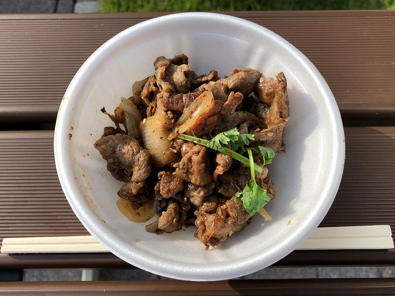 時間が経つと混むかなと思って最初に向かったところ既にえらく並んでいたこちらのお店の品。個人的にハラミ肉大好き(肉の部位で一番好きかも)な事に加え、火の通し加減、タレの味加減(おろしタマネギベース?)ともバッチリ。文句なしです。