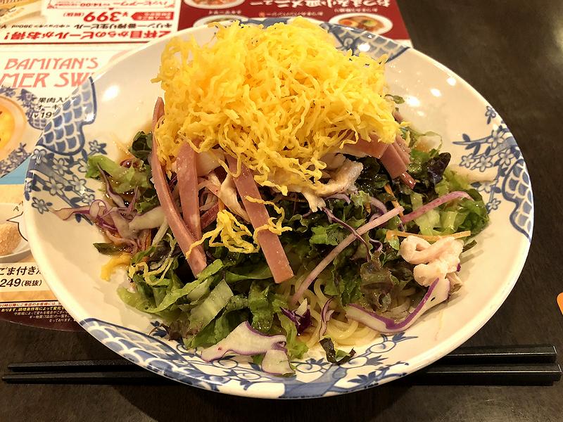 それでいただいたのが、この夏ハマっていた冷やし中華。ファミレスでもさすがに通年では無く期間限定メニューのようでしたが、逆に毎年バージョンが変わったりするんですかね。で、タレはベーシックな醤油味を選択。(他にごまダレも有り。)早速いただいてみると、味付けは酸味、塩気ともマイルド気味で口当たりが良いですね。このあたりは、最大公約数的な味付けとなるファミレスっぽさを感じます。また麺は、細縮れタイプで、冷やされているからコシ・歯応えが結構強めとなっていました。そして具は、ハムの他鶏肉が、チャイニーズレストランっぽく感じます。あと野菜はサニーレタスを中心にたっぷりと載りますが、錦糸玉子は調理済み品でしょうか?それと、途中から味偏しようと卓上の小袋入りマスタードを使ったところ、マスタード自体の風味が強くてさほど合わない気が。でもって、ラー油の方が良い感じでした。