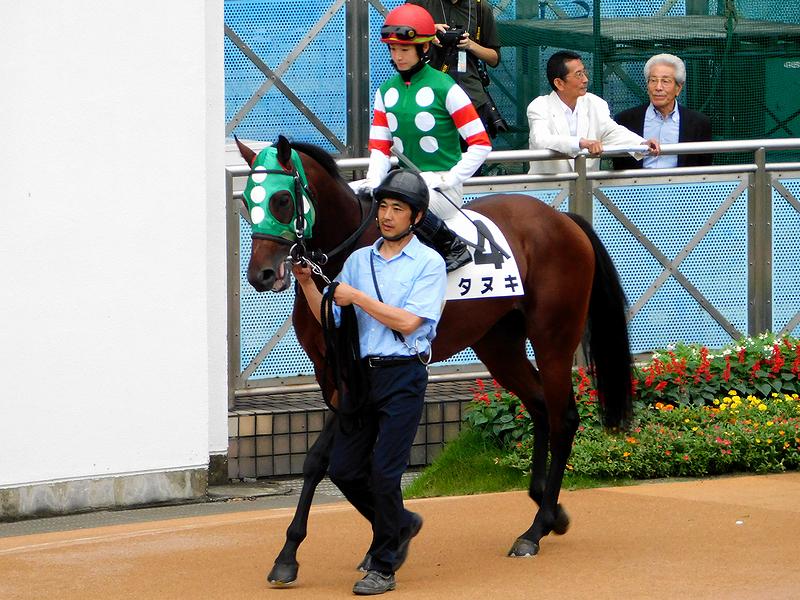 【第1レースのパドックを周回するタヌキ号と藤田菜七子騎手】