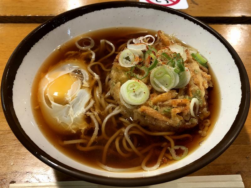 それで梅屋さんにも90周年記念サービスは、そば・うどん注文時生玉子サービス。ということで、お目当ての天玉そばがお得にいただけました。で、お味の方は、以前レストラン棟1階のお店で肉そばをいただいた時とはツユの印象が違い、出汁感はそこそこという感じ。このあたり、たまたまブレがあったのか、はたまたツユ自体が違うのかは不明なのですが。それでも、味自体は悪くなく、塩気も丁度良い感じです。またソバは茹で麺で、ふわっとした口当たりと若干柔らかめの食感。それと具のかき揚げは、柔らかいけどツユとはあまり馴染まないタイプ。タネにニンジンが多くて、それが珍しく感じました。