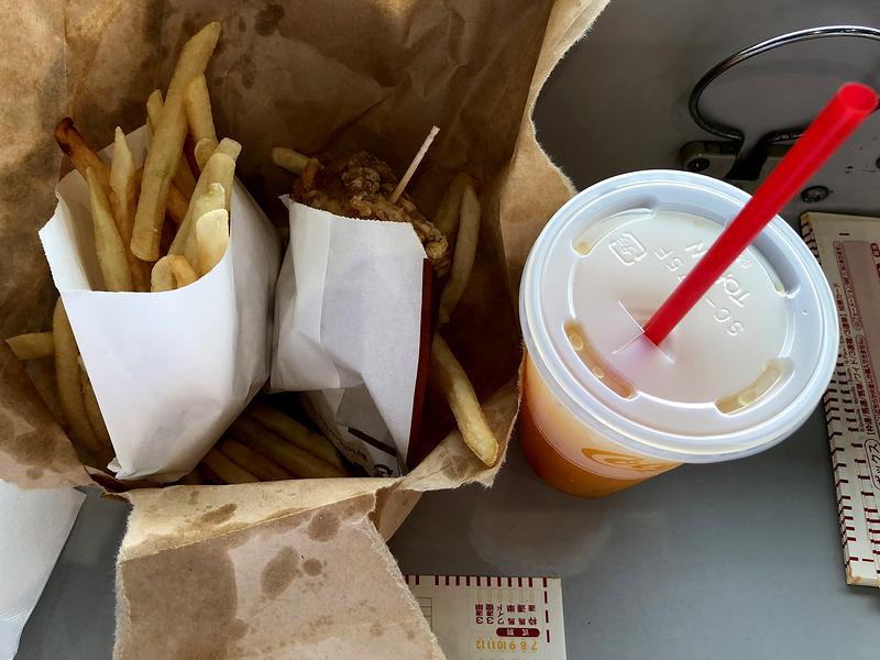 こちらのお店の90周年記念サービスは、唐揚げ、フライドポテト、ソフトドリンクのセットメニュー。で、こちらのお店で唐揚げは初めてなのですが、パリサククリスピーな衣に包まれた鶏肉は、フライドチキン同様の薄味に仕上げられています。もっとも、塩やマスタードの他ケチャップが付いていたので、それらを使って好みの味に仕上げれば全く問題なくいただけるのですが。