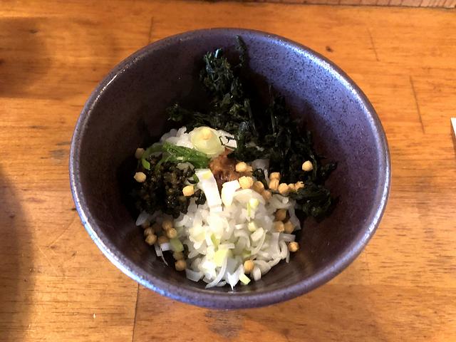 程なくして登場したこちらの品。早速スープからいこうとしたところ、個人的に連想する「鰹節」とは違うけどもとても食欲をそそる魚系の香りが。というのも、出汁に使う鰹節は焼津の「本枯節」を使用しているそうで、市販のリーズナブルな、いわゆる「鰹節」とは香りに結構違いがあるんですよね。で、リーズナブルな方の香り(それはそれで良い香りですが)=鰹節の香りという認識になっていた自分が、いい歳をしてちょっと恥ずかしくなったというか。(「鰹節」はざっくり言うと、煮た鰹を燻しながら乾燥させた「荒節」と、それに黴付けした「枯節」があり、後者の方が、手間がかかる分値段が高く、リーズナブルな市販品は荒節を使っていることが多いんです。)と、スープを飲む前に長くなってしまいましたが、口に含むと、枯節だけではなく鶏の香りやそれらの豊かな旨味が口の中に広がります。また、中くらいの太さのストレート麺は、前述のとおり蕎麦粉入りなのですが、黒い粒が見えるので(殻まで一緒に挽く方の)挽きぐるみを使っているのでしょうか?力強い香りが印象的。そして、スープの味付けが塩というのが心憎いというか、これら出汁や麺の風味を、存分に味わえるようになっていますね。それと具は、2種類のチャーシューや、良い塩梅の筍、シャキッとした歯触りを残した青菜と、全部が全部良いのですが、とにかくスープと麺が印象的なので、個人的には豪華な脇役というか引き立て役という感じに。で、麺や具を食べ終わった後は、付属のミニ茶漬け用の丼にスープを注ぎ入れて味わえば、これがまた!ご飯の上に乗っていた大葉味噌と叩き梅、そしてあられの味と香りが加わることによって、また違った味わいになりました。
