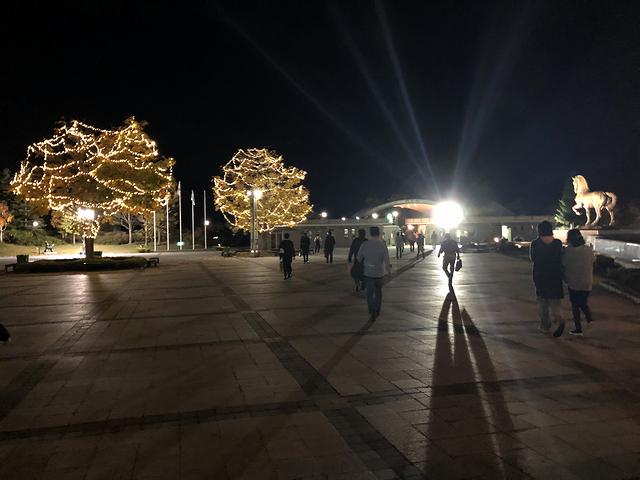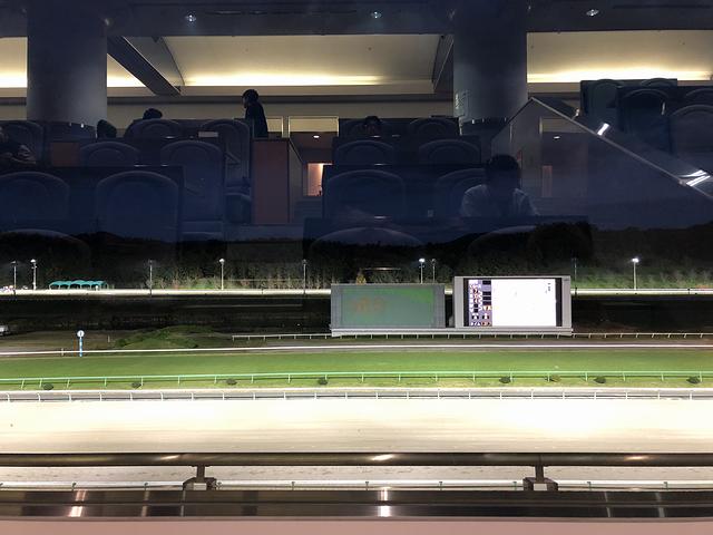 コース賞雌設置に伴い10月の開催から薄暮というか、日没後もレースが出来るようになった盛岡競馬場ですが、指定席から見るとこんな感じに。盛岡は山を削ってコースが作られたので、照明の光が一部その山を照らすからか、暗闇の中、コースが浮かび上がるように見えるんですよね。ほんと、綺麗です。