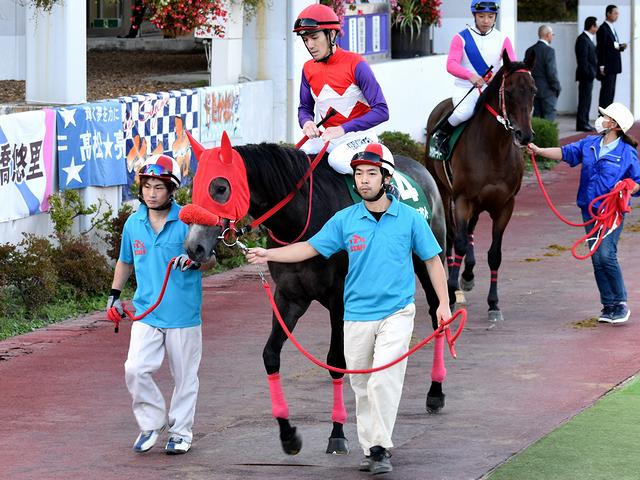 【1番人気の(5)コスモロングソード号と菅原俊吏騎手(馬主服)】