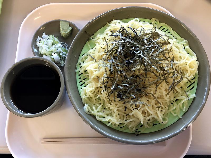 それで今回いただいたのは、実は東北地方を中心のメーカルメニューだったこちらの品。(「ざる中華」とも。)茹でてから流水で締めた中華麺を、そばつゆでいただくというものですが、盛岡競馬場のオジサマ・オジイサマ方は、夏場、良くいただいているような印象。で、入った薬缶ごと冷蔵庫で冷やされていたツユは、甘さ控えめで濃口な醤油っ気もしっかりとあるものの、エッジを落とした丸い印象。で、これがツルシコっとした中華麺と合いますね。更に、添えられたワサビも中華麺と合いますし、量的にもたっぷりあって、満足。