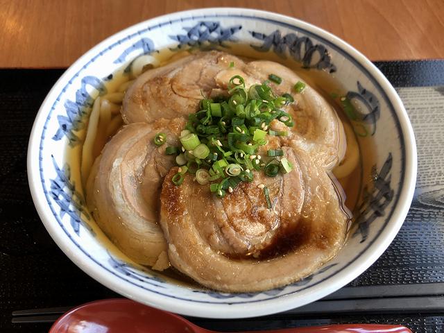 こちらは、家人がいただいた品。パっと見、かけうどんの上にチャーシューが載っている感じなのですが、例によって少々味見させてもらったところ、そのチャーシューにかかっているタレの甘辛ショウガ風味がツユ全体に溶け出して、私がいただいたツユとは別の味わいになっていました。