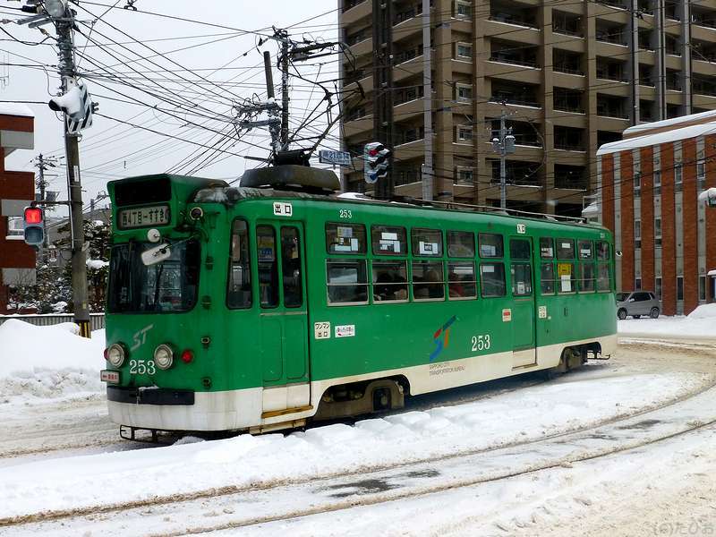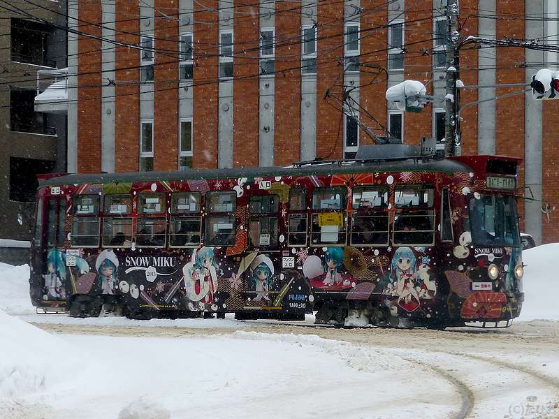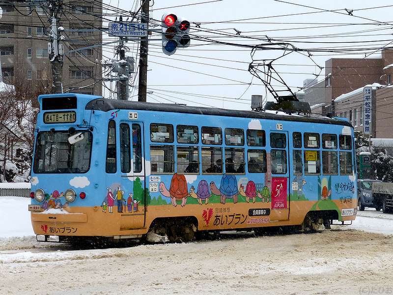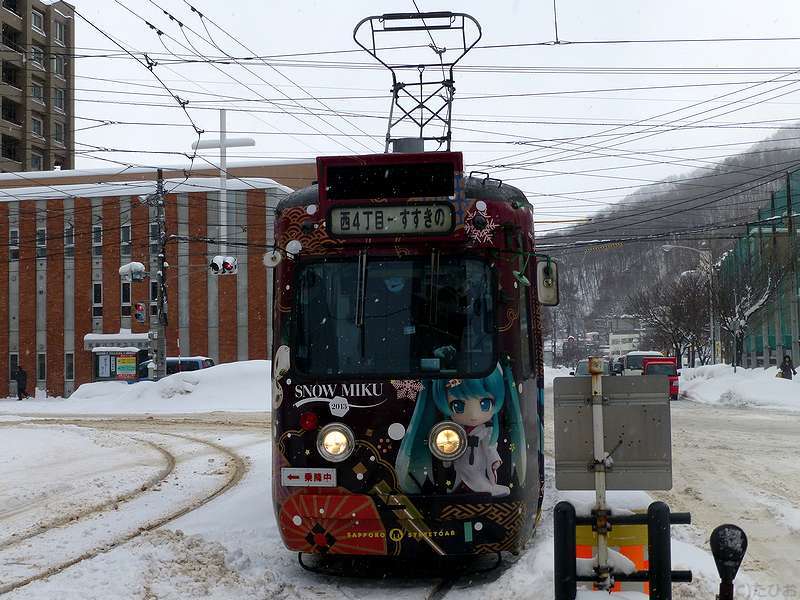 再び電車事業所前停留所へ戻り、またこれから向かうのと反対方向へと向かう電車や除雪作業を眺めるうちやって来た西4丁目行き電車は、全体がアニメっぽいキャラでラッピングされた物。で、乗り込むと、車内放送の声も違うような気もするので不思議に思っていたところ、車内の広告スペースをよく見ると『雪ミク電車』とありました。(そっち方面にはあまり詳しくないので…。)で、その雪ミク電車に使われていた210形電車ですが、今年3月末で引退になってしまうんですね。