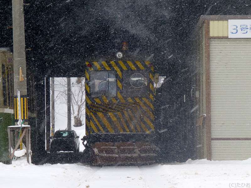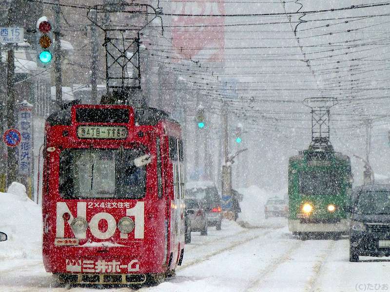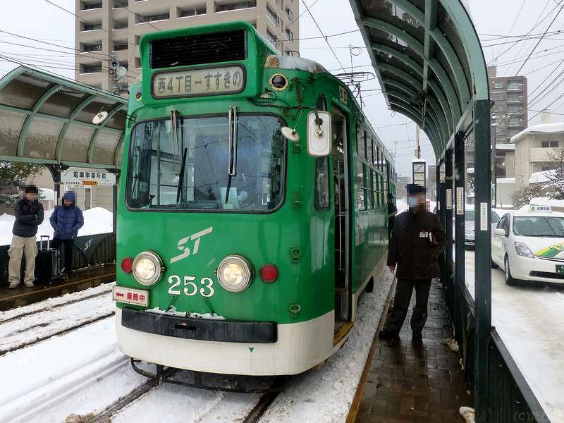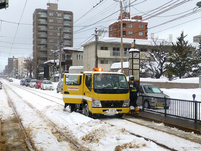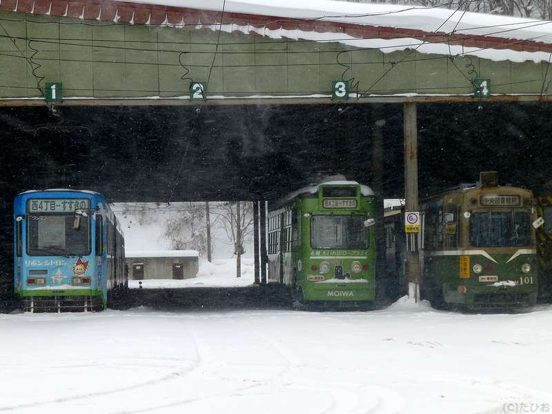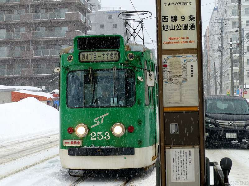 というわけで、ラーメン店から雪の中をちょっとだけ歩いて、西線9条旭山公園通(にしせんくじょうあさひやまこうえんどおり)停留場へ。ちなみにこちらの停留所は、ひらがな表記で20文字とかつて日本一長い駅名だったそう(その後抜かれて現在は3位だが、路面電車の停留所名としては現在も最長。)で。で、更に雪が強くなり、これから向かうのと反対方向に向かう電車や線路の除雪作業が行われている(昼間は、列車の合間に小型トラックで移動しながら行うんですね。)ところなど見ながら待つうちにやって来たすすきの行き電車に乗車。そこから5駅ほど乗って電車事業所前停留所へ。
