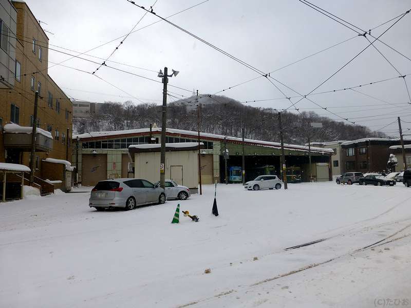 そんなわけで電車事業所。下の写真で門が開いているように見えるのですが、実はここが電車の出入り口。雪でほとんど隠れてますが、線路が構内に引き込まれています。そしてその奥に車輌センターというか車庫があり、電車が何両か休んでいたのですが、その中に『親子電車』親であるM101(ちなみに子のTc1は以前札幌市交通資料館で見た事が。)や、ササラ電車を発見。それをブロック塀越しにでも見ることが出来てとりあえずは満足できたというか、雪も酷くなってきたので撤収することにしました。