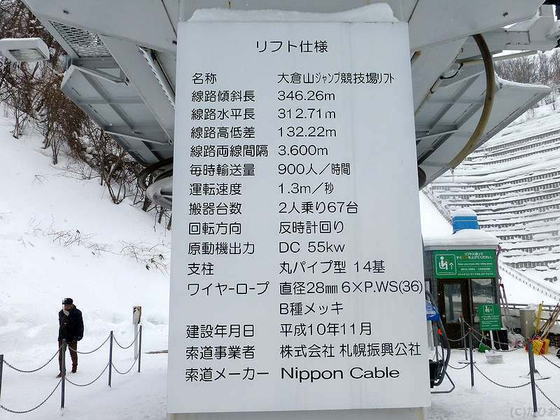 そして翌日。この日は貸切バスで市内観光だったのですが、その途中で立ち寄ったのが、スキージャンプのラージヒル競技が行われる大倉山ジャンプ競技場。ここには、麓というかジャンプ競技の着地点と、展望台というかジャンプ競技のスタート地点を結ぶ単線固定循環式の特殊索道(さくどう)、要するにリフトがあります。正直、高いところは少々苦手なのですが、元乗り鉄といたしましては、鉄道にからむ乗り物(もっとも、特殊索道は鉄道事業法に規定があるとはいえ、鉄道と見なされないことが多いですが。)には、是非とも乗っておきたいところ。で、幸運にも(時間の関係で、同じ所にある札幌ウインタースポーツミュージアムとどちらかしか回れなかったんです。)そのリフトに乗ることが出来ました。