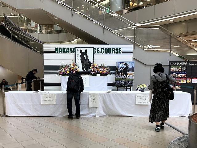 4月1日に亡くなった、牝馬ながら平成19年(2007年)の第74回東京優駿(日本ダービー)に勝利するなどGⅠ通算7勝をあげJRA顕彰馬にもなったウオッカ号の献花台と記帳台が、地下1階に設けられていました。で、先週の福島競馬場では朝イチで飲んじゃって記帳できなかったため(酔って書くものでもないし。)、シラフのうちに記帳。ほんと、惜しい名馬をなくしてしまいましたねぇ。